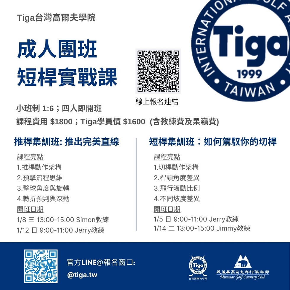#美麗華創新 繼「午後九洞」大受歡迎之後,美麗華與台灣高爾夫學院再為您推出成人短桿實戰課程,由專業教練利用短桿區與練習果嶺擬真情境施教,輕鬆解決你的短桿及推桿困擾。