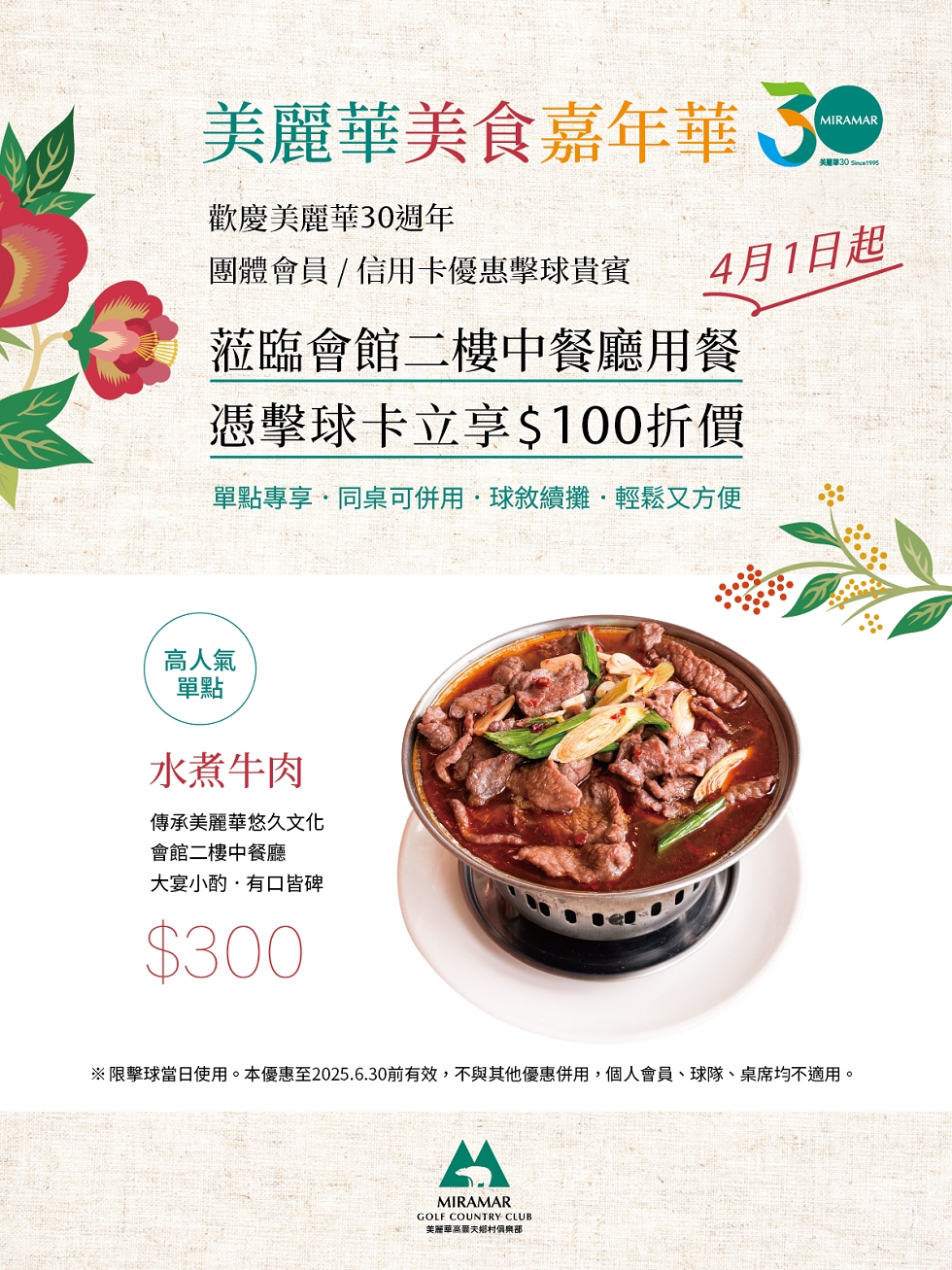 慶祝美麗華創立30週年,4月1日,團體會員及信用卡優惠擊球貴賓駕臨會館二樓中餐廳,憑當日擊球卡消費即可扣抵100元,同桌可併用,以最經濟的花惠享受美麗華歡迎的各式單點料理。(球隊桌菜另享優惠,不併用本專案)