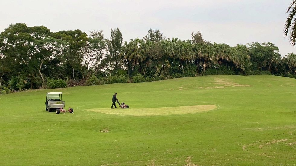 而在北區第4洞,我們另闢臨時果嶺,原果嶺暫停使用,重點保養。此外在部分弱勢區域也進行打洞鋪沙與局部補草,務使受損區域盡快恢復原貌。