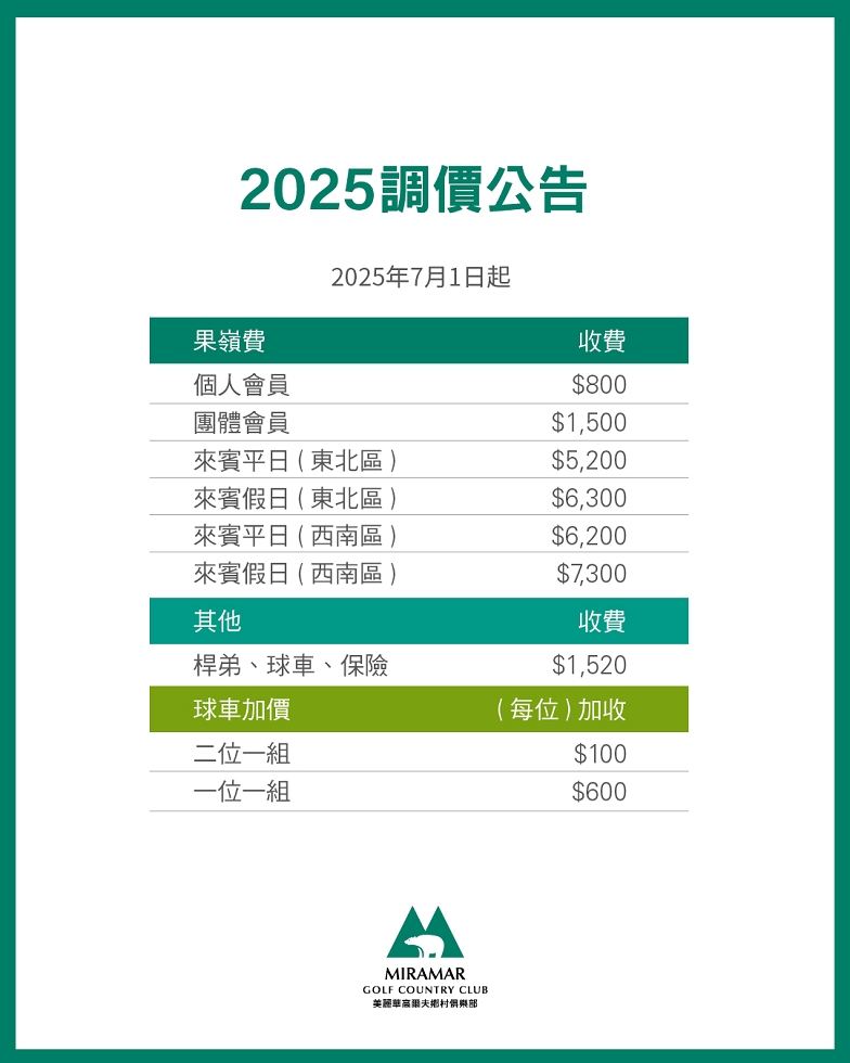 為反映這段期間投入於球場改善的各項成本,我們將自2025年7月1日起酌予調整來賓果嶺費收費,特此報告。迎接美麗華30週年,我們將秉持「榮耀向前,追求卓越」理念,積極為您服務。歡迎您偕同好友一同駕臨球敘,分享美麗華榮耀!