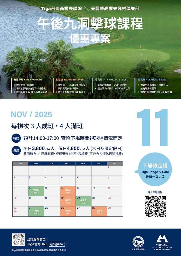 #美麗華創新 十一月「午後九洞」課程出爐了!這項別具創意的計劃,讓你可以置身5次LPGA賽事指定的美麗華場地,在專業教練的指導下,一面上課、一面感受尼克勞斯(Jack Nicklaus)的攻略思維,是一次難得的經驗,許多學員都一上再上。